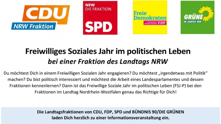 Freiwilliges Soziales Jahr im politischen Leben 11.03.2019 bei einer Fraktion im Landtag Nordrhein-Westfalen Du möchtest Dich in einem Freiwilligen Sozialen Jahr engagieren? Du möchtest „irgendetwas mit Politik“ machen? Du... mehr lesen