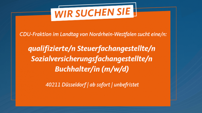 CDU-Landtagsfraktion sucht: Steuerfachangestellte/n oder Buchhalter/in (m/w/d) 06.03.2023 Zur Verstärkung unseres Teams suchen wir zum nächstmöglichen Zeitpunkt eine/n:qualifizierte/n Steuerfachangestellte/n,... mehr lesen