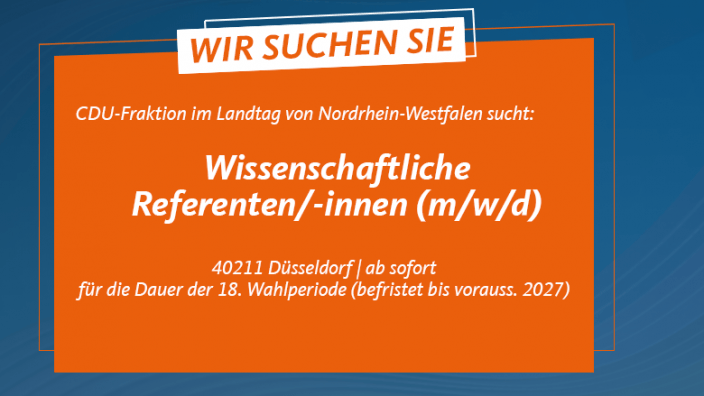 CDU-Landtagsfraktion sucht: Wissenschaftliche Referenten/-innen (m/w/d) 06.03.2023 Zur Verstärkung unseres Teams suchen wir zum nächstmöglichen Zeitpunkt:Wissenschaftliche Referenten/-innen (m/w/d)... mehr lesen