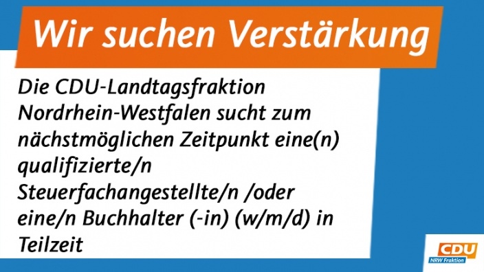 Wir suchen Verstärkung in der Buchhaltung 05.09.2022 Die CDU-Landtagsfraktion Nordrhein-Westfalen sucht zum nächstmöglichen Zeitpunkt eine(n) qualifizierte/n... mehr lesen